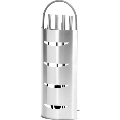 Hochwertiges Kaminbesteck, 5-teilig, bestehend aus Ständer aus Edelstahl und vier Besteckteilen (Besen, Zange, Schaufel und Stocheisen).