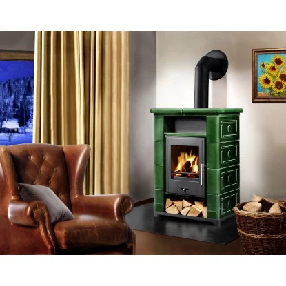 Mit seiner Keramikverkleidung sorgt der Wamsler Kaminofen Montafon für ideale Wärmespeicherung und wird zum Blickfang im Wohnraum. Die kachelartige Verkleidung im klassischen Grün gibt dem Kaminofen einen ganz individuellen, rustikalen Look und steht für Gemütlichkeit. Der Kaminofen ist klein und kompakt und passt so in jedes Zimmer. Das Rauchrohr hat einen Anschluss für oben.