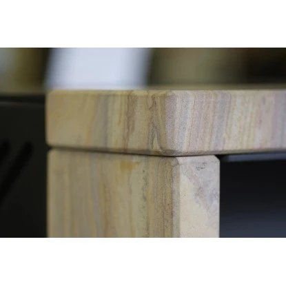 Die seitlichen Säulen sind mit Sandstein verkleidet. Diese Verkleidung ist eine absolute Aufwertung Ihres Wohnzimmers. Der natürliche Stein verleiht Ihrem Kaminofen eine ganz einzigartige Struktur und persönliche Note und speichert die Wärme.